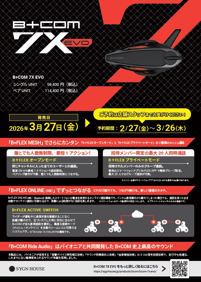 B+COM 7X EVO 3月27日新発売 2026/03/12 サインハウスのインカムB+COMがフルモデルチェンジで新発売!! 今回の7X EVOはメッシュ通信とオンライン通信の2つの通信方式を採用した 新開発の通信方式「B+FLEX」を搭載。 「B+COM 7X EVO」では、この2つの通信方式を自動で最適な方式に切替えるハイブリッド型で、 走行中に切替えを意識せずシームレスな通話ができます。 シングル59.400円、ペア114.400円 3月27日新発売、ご予約受付中です。 当店ではインカムお買上頂くと無料でヘルメットに取り付け致します。